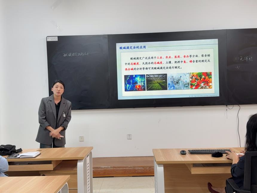 刘佳人老师在分析化学课程里,重点讲解“酸碱滴定的应用”,结合生产生活中的实例,让学生明白酸碱滴定这一基本分析方法的广泛用途和重要意义。
