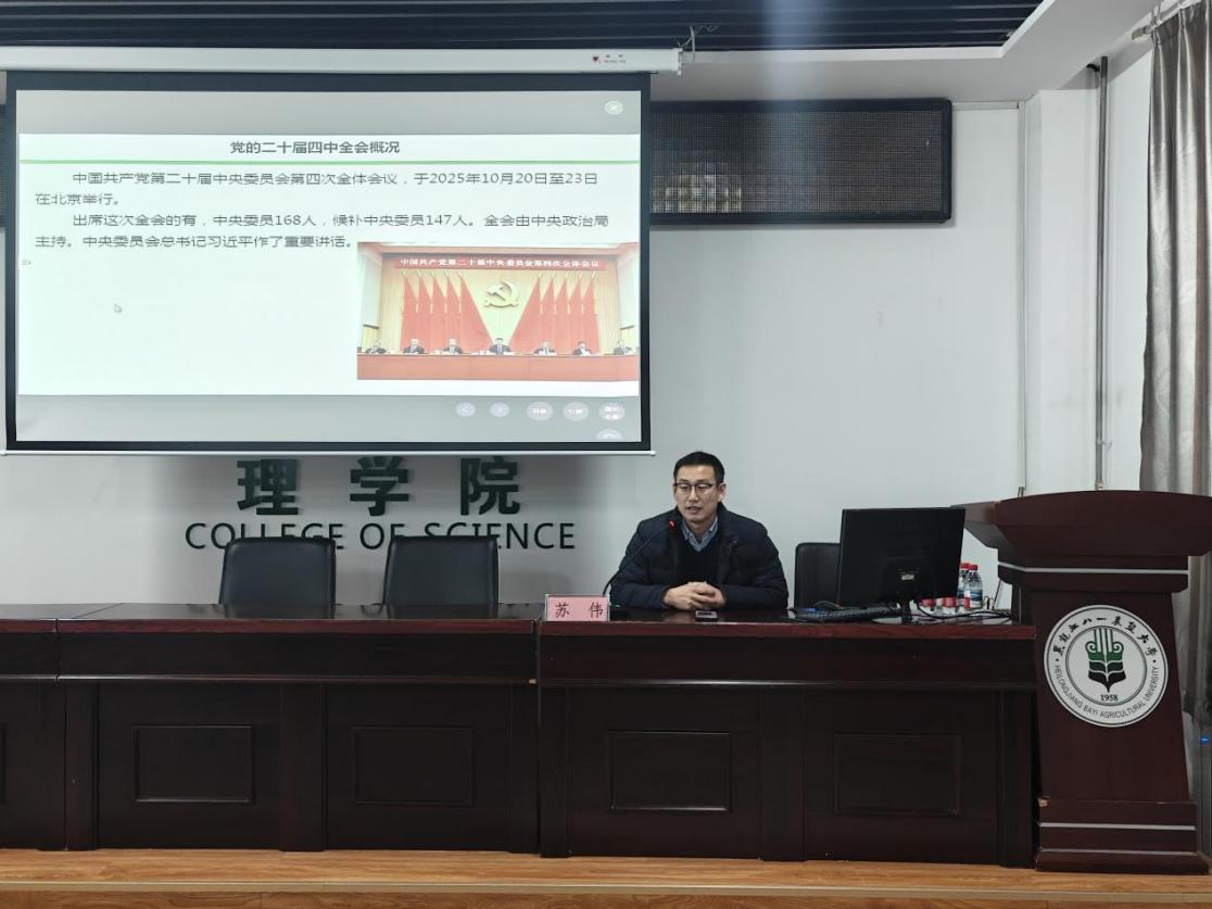 为深入学习贯彻党的二十届四中全会精神,2025年11月4日,理学院党委邀请马克思主义学院苏伟老师以《夯实基础全面发力,奋力开创中国式现代化建设新局面》为主题进行党的二十届四中全会精神专题报告,会议由学院党委书记刘丽主持,理学院全体教职工及学生党员参加。